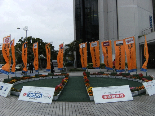 りゅうぼうの前にキャンプしている球団ののぼりがあり、そばに案内所もある。
