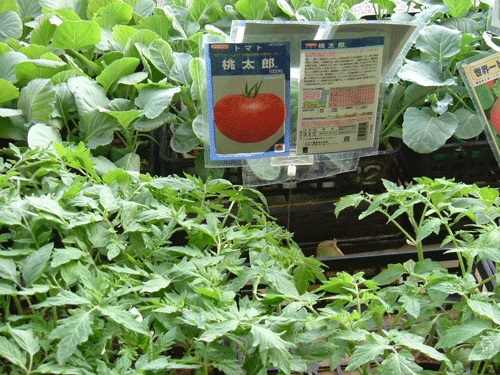 はにんす7/10 。「かねひで」トマト、ナス、レタス、春菊、南蛮(とうがらし)の苗が売っている。ビックリ!