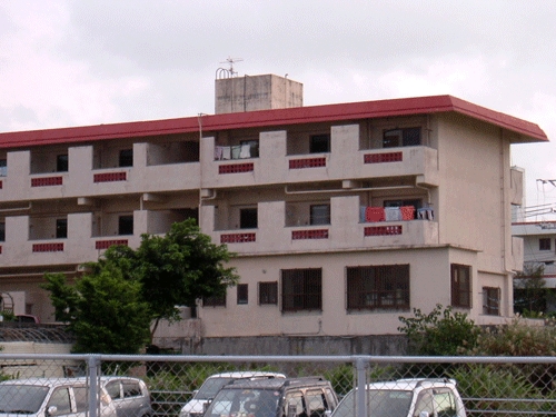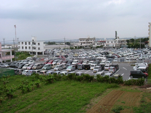 秘密基地から見える沖縄国際大学の第3・4駐車場、基地の前には第5駐車場がある。