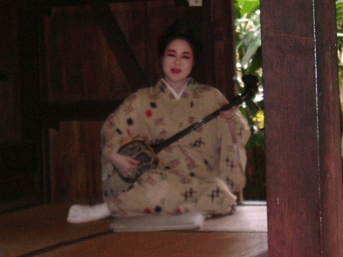 琉球村。三線で歌っている。