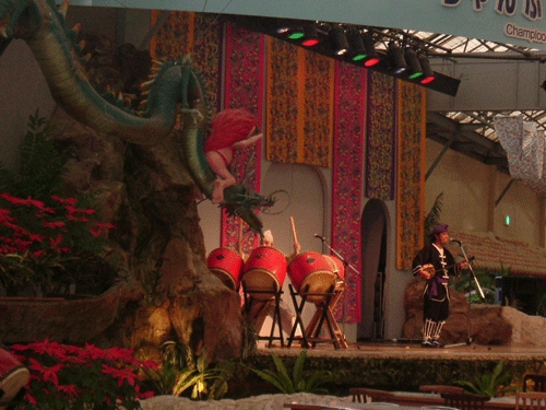 琉球村。ちゃんぷる劇場で最後の楽曲で島唄を歌っていた。。